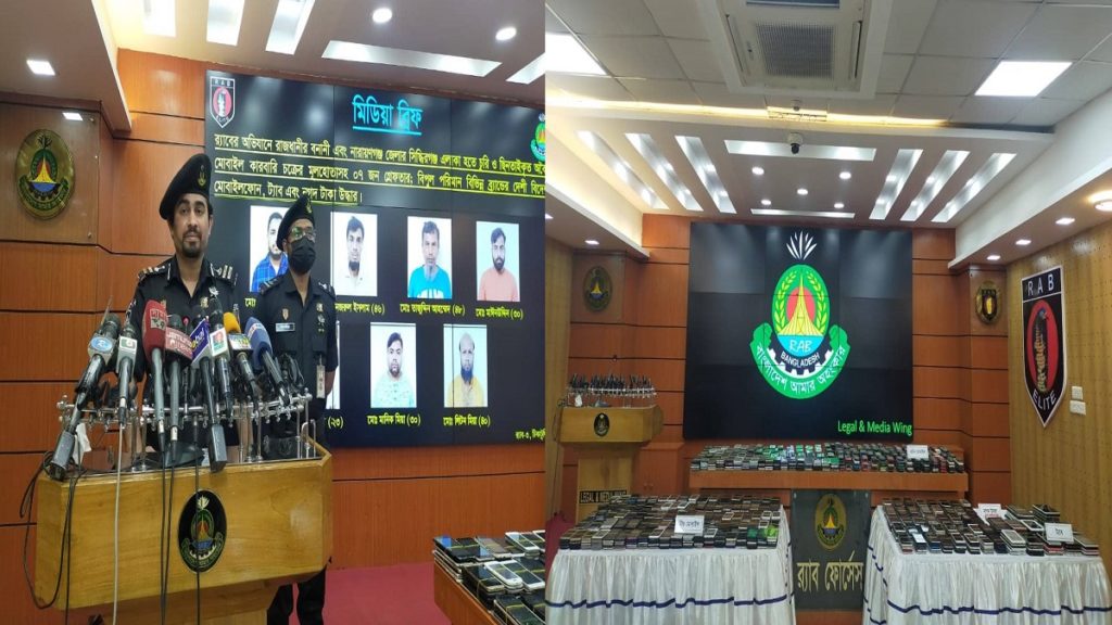 র্যাবের অভিযানে রাজধানীর বনানী এবং নারায়ণগঞ্জের সিদ্ধিরগঞ্জ এলাকা থেকে চুরি ও ছিনতাইকৃত অবৈধ মোবাইল কারবারি চক্রের মূলহোতাসহ ৭ জনকে গ্রেফতার করেছে র্যাব-৩। এ সময় তাদের কাছ থেকে বিভিন্ন ব্র্যান্ডের বিপুল পরিমাণ দেশি-বিদেশি মোবাইলফোন, ট্যাব এবং নগদ টাকা উদ্ধার করা হয়।