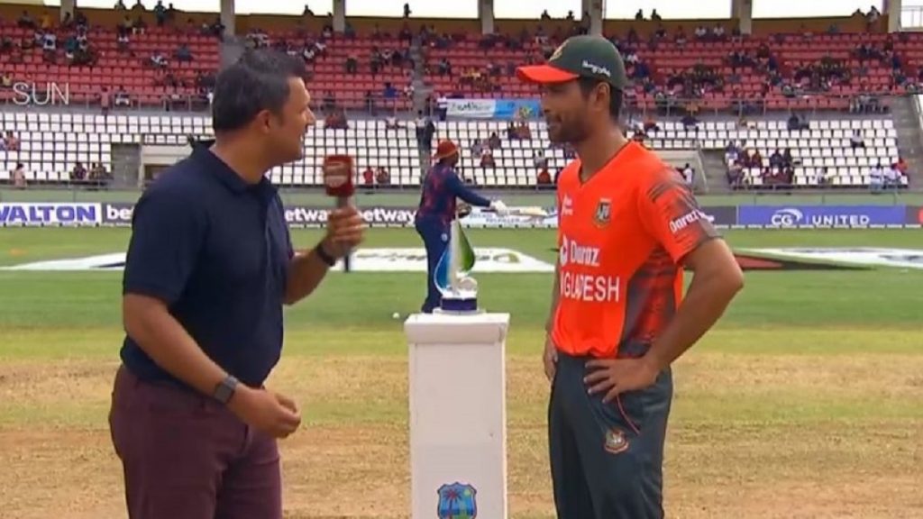 টসের সময় বাংলাদেশ অধিনায়ক মাহমুদউল্লাহ রিয়াদ জানিয়েছেন, টস জিতলে বোলিং বেছে নিতেন তিনি। বললেন, ‘আমরাও আগে বল করতে চাইতাম। ওয়েস্ট ইন্ডিজ একটি ভালো টি-টোয়েন্টি দল এবং আমাদের ভালো খেলা উচিত। এটা একটা নতুন উইকেট। পরিস্থিতিটা দ্রুতই মূল্যায়ন করতে হবে আমাদের।’