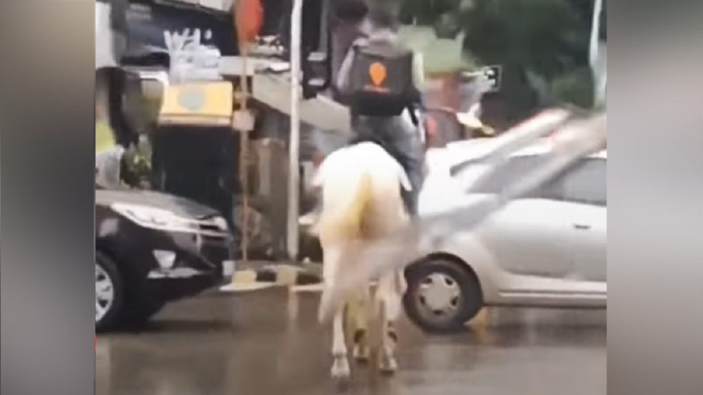 ভিডিওতে দেখা যায়, পিঠে খাবার সরবরাহকারী সংস্থার দেয়া ব্যাগ নিয়ে সাদা ঘোড়ায় চেপে চলছেন এক ব্যক্তি। পিছনে কোনো গাড়ি থেকে করা হয়েছে সেই ভিডিও। বৃষ্টিতে কাজের গতি থেমেছে হয়তো, কিন্তু দায়িত্বে অনড় ওই কর্মী ঘোড়ায় চড়ে খাবার ডেলিভারি দেয়ার উদ্যোগকে সকলেই সাধুবাদ জানিয়েছেন।