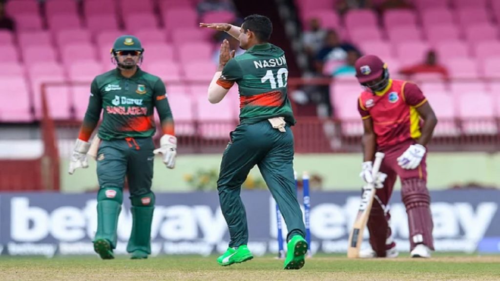 টস হেরে ব্যাট করতে নেমে খুবই সতর্কভাবে ইনিংস শুরু করেছিল দুই উইন্ডিজ ওপেনার শাই হোপ ও কাইল মায়ার্স। তবে শেষ রক্ষা হয়নি। মোসাদ্দেক হোসেনের বলে বোল্ড হয়ে মায়ার্স সাজঘরে ফিরলে মাত্র ২৭ রানে ভাঙে উইন্ডিজের উদ্বোধনী জুটি। এরপর একে একে নাসুম তুলে নেন শামার ব্রুকস, শাই হোপ ও উইন্ডিজ অধিনায়ক নিকোলাস পুরানের কাঙ্ক্ষিত উইকেট। এর মাঝে ক্যারিবিয়ান ব্যাটিংয়ের প্রধান শক্তি পুরানকে প্রথম বলেই বোল্ড করেন নাসুম। এরপর রভম্যান পাওয়েলকে আউট করেন শরীফুল ইসলাম। আর আকিল হোসেন হন রান আউট।