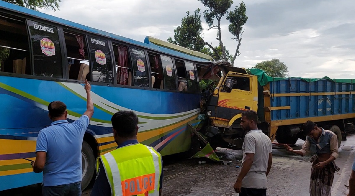 মুখোমুখি সংঘর্ষে দুমড়ে মুচড়ে গেছে বাস ও ট্রাকের সামনের অংশ।