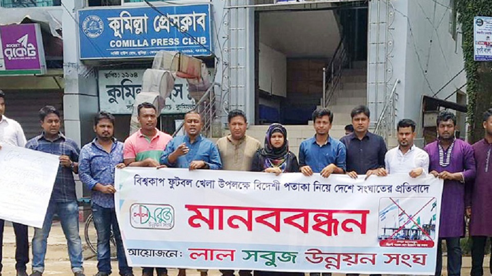 বিশ্বকাপ ফুটবল খেলা উপলক্ষে বিদেশি পতাকা নিয়ে দেশে সংঘাতের প্রতিবাদে এবং এসব পতাকা প্রদর্শন বন্ধের দাবিতে কুমিল্লায় মানববন্ধন কর্মসূচি পালন করা হয়েছে।