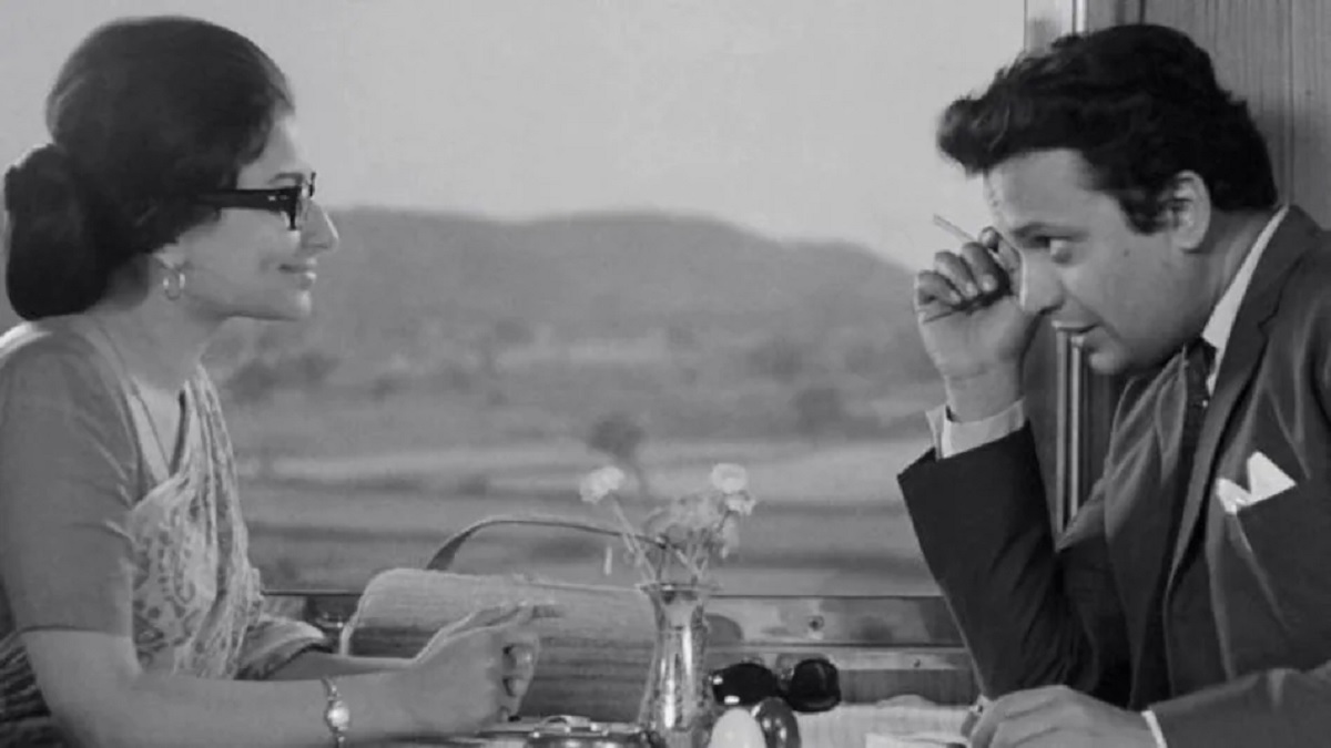 সত্যজিৎ রায়ের 'নায়ক' সিনেমার একটি দৃশ্যে মহানায়ক উত্তম কুমার ও শর্মিলা ঠাকুর।