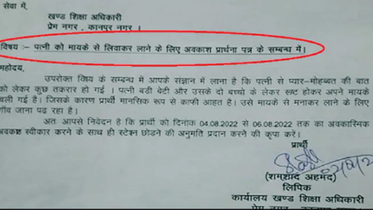 জানা যায়, ওই ব্যক্তির নাম শামশাদ আহমেদ। তিনি কানপুরের একজন শিক্ষা কর্মকর্তা। কিছুদিন আগে বউয়ের সাথে কথা কাটাকাটি হয় তার। দুই মেয়েকে সাথে নিয়ে শামশাদের স্ত্রী বাপের বাড়ি চলে যান। বিষয়টি নিয়ে অনেক চিন্তিত ছিলেন শামশাদ। শেষমেশ আসল কারণ জানিয়ে বসের কাছে ছুটির আবেদন করেন তিনি। ৪ আগস্ট থেকে ৬ আগস্ট পর্যন্ত ছুটির আবেদন করেছেন শামশাদ।