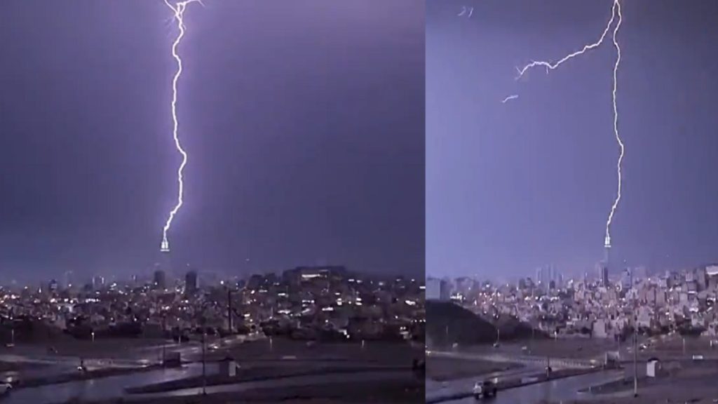 সৌদি আরবের পবিত্র নগরী মক্কার বিখ্যাত ক্লক টাওয়ারে বজ্রপাতের ঘটনা ঘটেছে। এই বজ্রপাতের একটি ভিডিও সামাজিক যোগাযোগমাধ্যমে ভাইরাল হয়েছে। ভিডিওতে দেখা যায়, বৃষ্টিস্নাত সন্ধ্যায় এই স্থাপনায় আঘাত হানে বজ্রপাত। এতে ওই এলাকার আকাশে আলোর ঝলকানি ছড়িয়ে পড়ে।