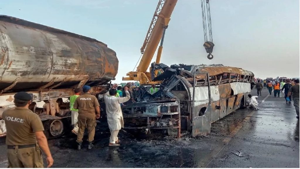 পুলিশ জানায়, লাহোর থেকে করাচির দিকে যাচ্ছিলো একটি যাত্রীবাহী বাস। এ সময় চালক নিয়ন্ত্রণ হারালে পেছনে থাকা তেলের ট্যাংকারের সাথে লাগে ধাক্কা। মুহূর্তেই দুটি যানে ছড়িয়ে পড়ে আগুন। মুলতানের হাসপাতালে চিকিৎসা নিচ্ছেন গুরুতর দগ্ধ বাকিরা। প্রাথমিক তদন্তে বেরিয়ে এসেছে দুর্ঘটনায় আগে ঘুমন্ত অবস্থায় ছিলেন বাসের চালক।