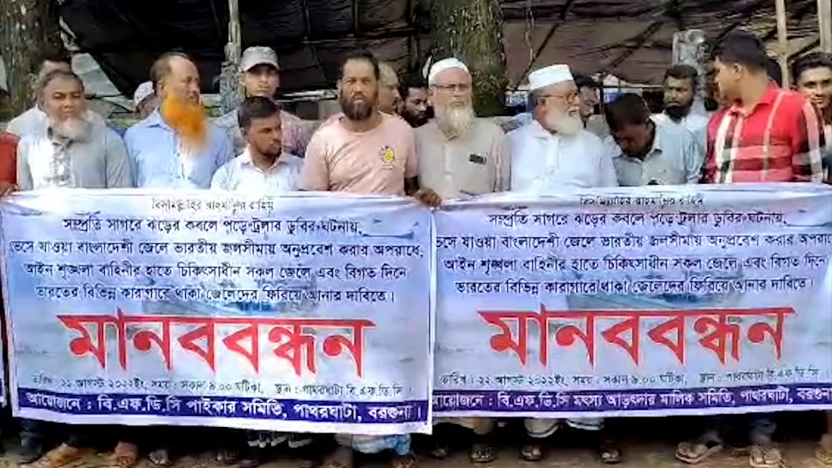 ঝড়ের কবলে পড়ে ভারতে ভেসে যাওয়া জেলেদের কোনো জটিলতা ছাড়েই দেশে ফিরিয়ে আনার দাবিতে মানববন্ধন হয়েছে বরগুনায়।
