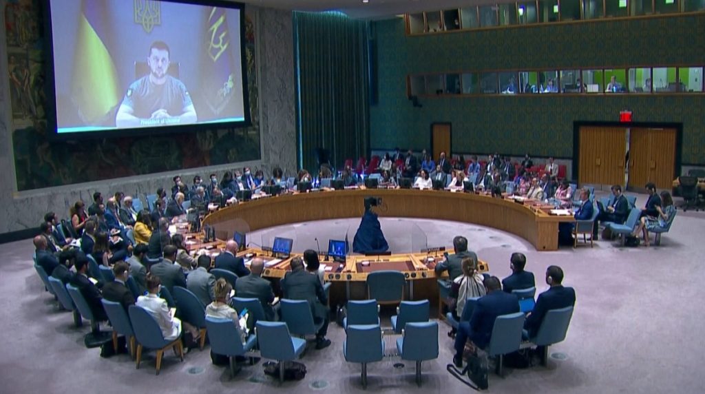 ১৫ সদস্যের নিরাপত্তা পরিষদে ভিডিও টেলি-কনফারেন্সে ইউক্রেনের প্রেসিডেন্ট যুক্ত হবেন কিনা- ওঠে সেই প্রশ্ন। জাতিসংঘে নিযুক্ত রুশ দূত ভ্যাসিলিয়া ন্যাবেঞ্জিয়া ভোটাভুটির প্রস্তাব দেন। জেলেনস্কির ভাষণের পক্ষে সমর্থন জানায় ১৩ সদস্য। এ প্রস্তাবে রাশিয়া বিপক্ষে ভোট দেয়; বিরত ছিল চীন।