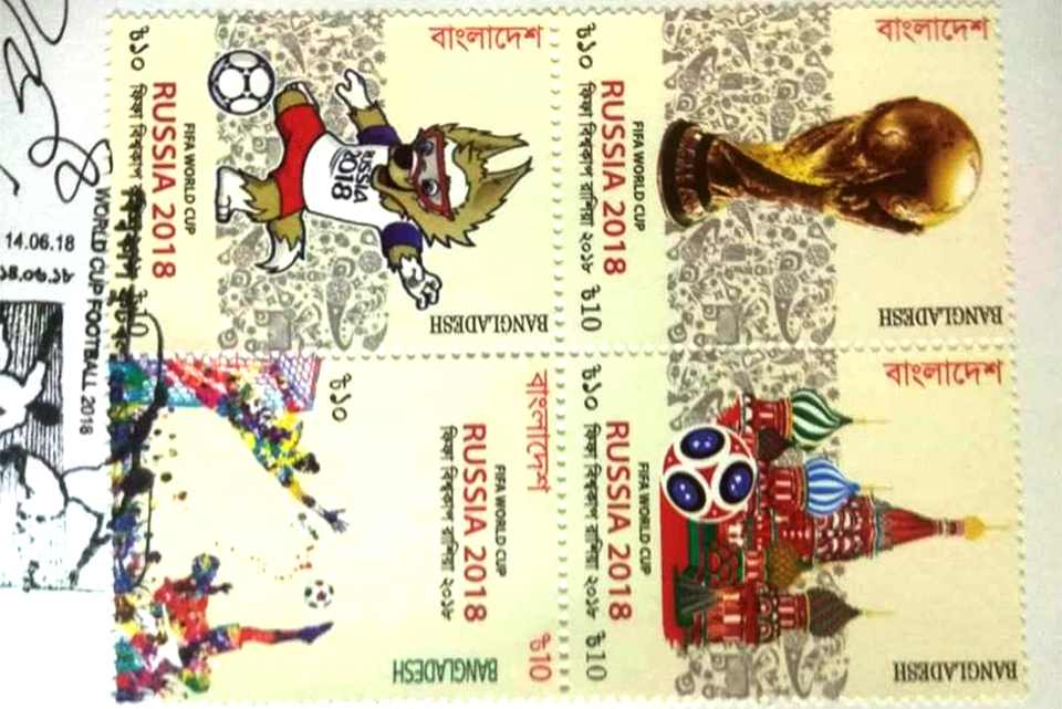 বিশ্বকাপ ফুটবল ২০১৮ উপলক্ষে আজ সকাল ১২টায় স্মারক ডাক টিকিট, স্যুভিনর শিট ও খাম উন্মোচন করেছেন ডাক ও টেলিযোগাযোগ মন্ত্রী মোস্তফা জব্বার। ১০ টাকা মূল্যের ৪টি, পঞ্চাশ টাকা মূল্যের ২টি স্যুভিনর শিট, দশ টাকার খাম ও পাঁচ টাকা মূল্যের ডাটা কার্ড প্রকাশ করা হয়েছে। এসময় বিশেষ সিলমোহর ব্যবহার করা হয়েছে।