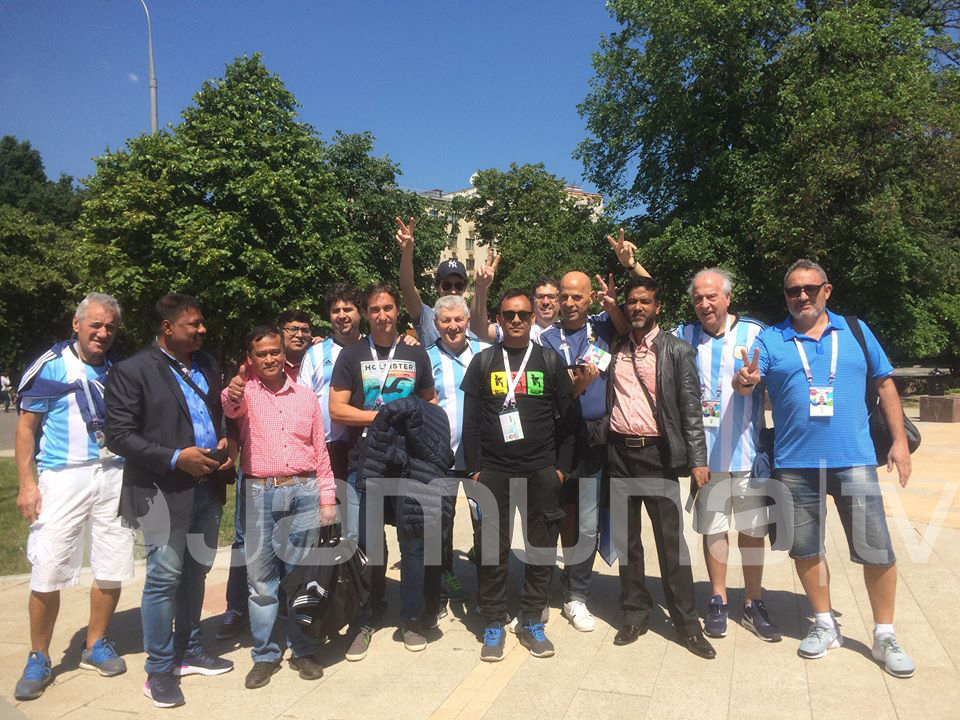 ঈদের দিনে বাংলাদেশী ভক্ত সমর্থকও কম নেই এখানে। যদিও রাশিয়ায় ঈদ হয়ে গেছে গতকাল ১৫ জুন। এক বাংলাদেশির সাথে আরেক বাংলাদেশি দেখা হলেই কোলাকুলি করছেন। ঈদ মুবারক জানাচ্ছেন। এর মাঝে যারা দেশ থেকে ফ্যান আইডি সংগ্রহ করতে পারেন নি তারা স্টেডিয়ামের পাশের বুথ থেকে আইডি সংগ্রহ করছেন। এখানেই দেখা আর্জেন্টিনার কর্দোভা থেকে আসা মিগেল ও ইমিলিয়ানোর। আইসল্যান্ডের বিপক্ষে কি আশা করছেন জানতে চাইলে। বুড়ো মিগেলের আশা ৫-১ গোলে জিতবে তার দল। তবে বাস্তববাদী তরুন ইমিলিয়ানো। তিনি আশাবদী আর্জেন্টিনা জিতবে ২-০ গোলে।