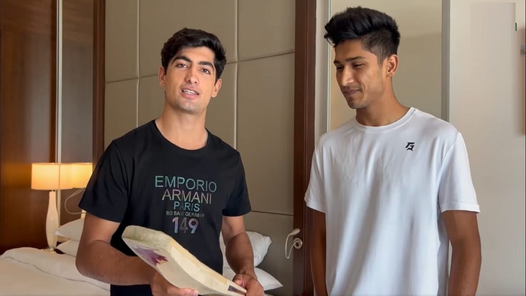 হাসনাইনের থেকে ব্যাট নিয়ে নাসিম শাহ বলেন, আমি এই ব্যাটটি নিলামের জন্য দিতে চাই এবং এই নিলাম থেকে পাওয়া অর্থ বন্যার্তদের ফান্ডে দেবো।