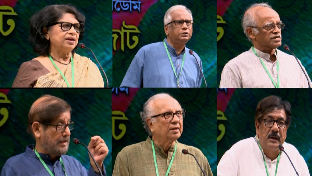 সম্মিলিত সাংস্কৃতিক জোটের সভাপতি গোলাম কুদ্দুস বলেন, শিক্ষা ব্যবস্থা থেকে শুরু করে রাষ্ট্রীয় কাঠামোর সকল স্তরে সাম্প্রদায়িক শক্তি, মুক্তিযুদ্ধের চেতনাবিরোধী শক্তি ও গণতন্ত্রবিরোধী শক্তির একটি শক্ত অবস্থান আমরা প্রত্যক্ষ করছি।