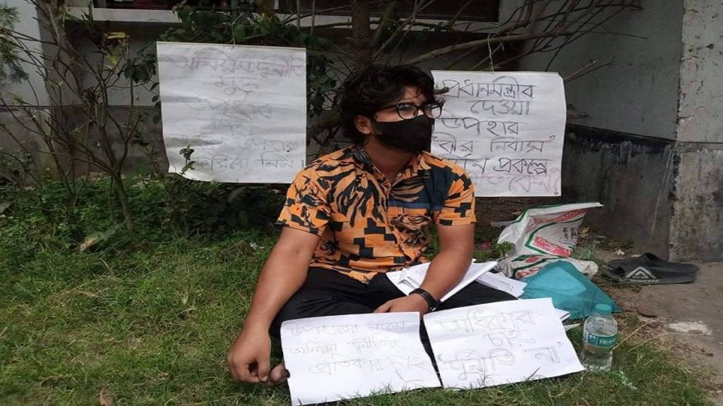 সাকিব মোল্লা বলেন, আমি ঢাকায় লেখাপড়া করি। এলাকায় কোনো ঘরবাড়ি না থাকায় নানার বাড়িতে থাকি। একদিকে নিম্নমানের সামগ্রী ব্যব্হার করে কাজ শুরু করা, অপরদিকে সামগ্রী বহনের ব্যয় করার জন্যও চাপ দেয়া হয়। এ অনিয়মের প্রতিকার চেয়ে আমার মা লিখিত অভিযোগ করেন। পরে একাধিকবার মৌখিকভাবে অবগত করা হয় কিন্তু কোনো পদক্ষেপ না নেয়ায় আমি এখানে অবস্থান করে প্রতিবাদ জানিয়েছি।