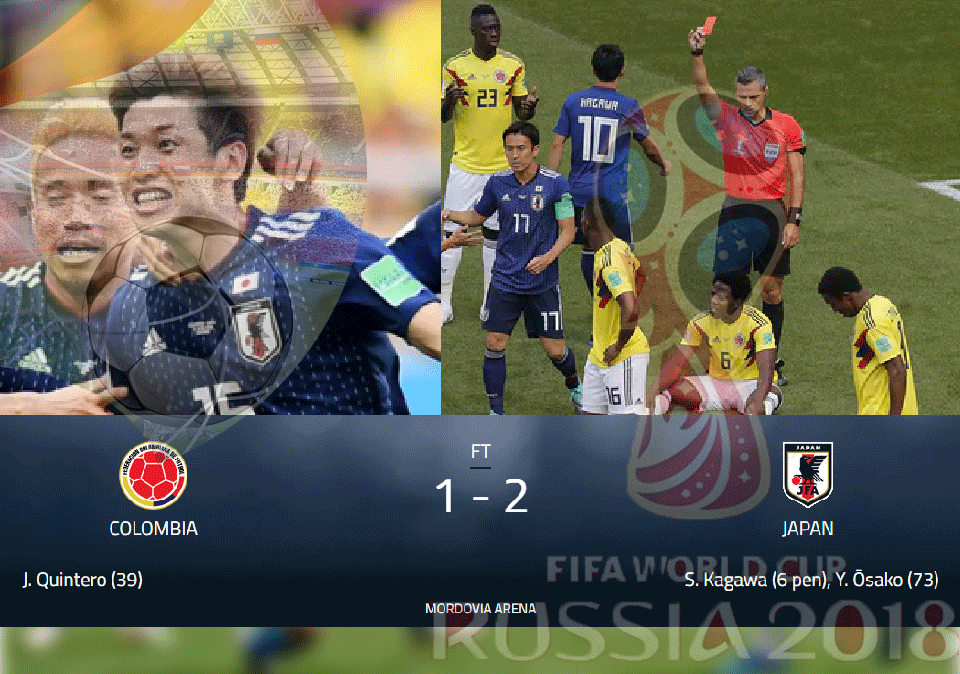 রাশিয়া বিশ্বকাপে অঘটনই যেন ঘটনা হয়ে দাঁড়িয়েছে। আপসেট লিস্টে যুক্ত হলো আরেকটি নাম-কলম্বিয়া। লাল কার্ডই কাল হয়ে দাঁড়ালো তাদের। আর এশিয়ার প্রথম দল হিসেবে লাতিন আমেরিকার কোনো দেশকে হারানোর ইতিহাস গড়লো জাপান।