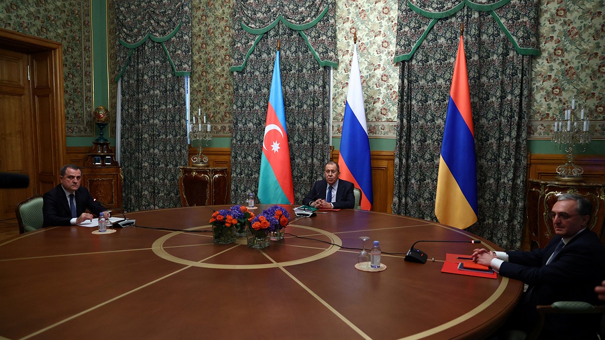 আর্মেনিয়া ও আজারবাইজানের প্রতিনিধির সাথে আলাপরত রুশ পররাষ্ট্রমন্ত্রী সার্গেই লাভরভ (আনাদোলু থেকে নেয়া ছবি)।
