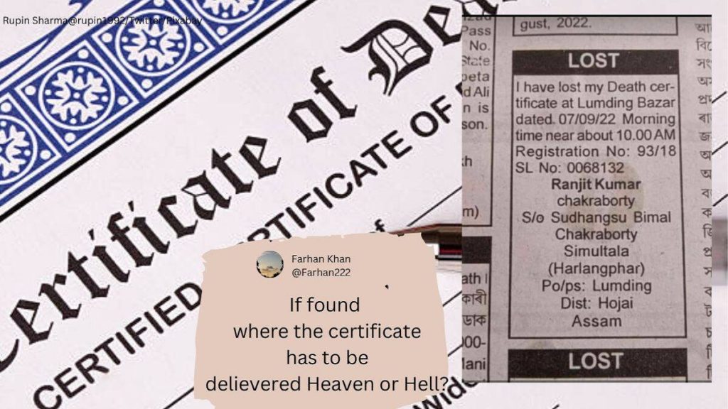 নিজের মৃত্যু সনদ হারিয়ে পত্রিকায় বিজ্ঞাপন! অবাক হচ্ছেন? অবাক হওয়ার মতোই ঘটনা বটে। কিন্তু সম্প্রতি এমন এক ঘটনা ঘটেছে ভারতের আসামে।