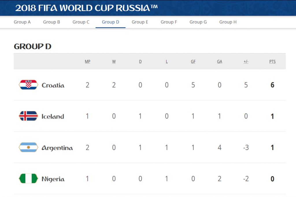 অন্যদিকে, যদি সুপার ঈগলরা আইসল্যান্ডকে হারিয়ে ৩ পয়েন্ট সংগ্রহ করে তাহলে তারা আর্জেন্টিনা থেকে ২ পয়েন্টে এগিয়ে থাকবে। এমন অবস্থায় যদি আর্জেন্টিনা নাইজেরিয়াকে হারিয়েও দেয়, তার পরও আইসল্যান্ডের সাথে ক্রোয়েশিয়ার ম্যাচ গুরুত্ব বহন করবে। কারণ আইসল্যান্ড ক্রোয়েশিয়াকে হারিয়ে দিলে আবারও সামনে চলে আসবে গোল ব্যবধান।