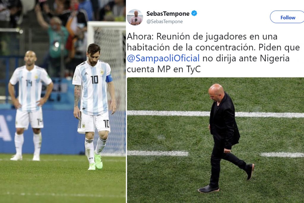 আর্জেন্টাইন গণমাধ্যম মুন্ডো আলবিসেলেস্তে খবর দিয়েছে, ম্যাচের পর খেলোয়াড়রা নাকি সবাই জড়ো হয়ে বৈঠক করেছে এবং সেখান সিদ্ধান্ত হয়েছে তারা হোর্হে সাম্পাওলিকে হেড কোচ হিসেবে চান না। নাইজেরিয়ার বিপক্ষে ম্যাচের আগেই তাকে অপসারন করা হোক।