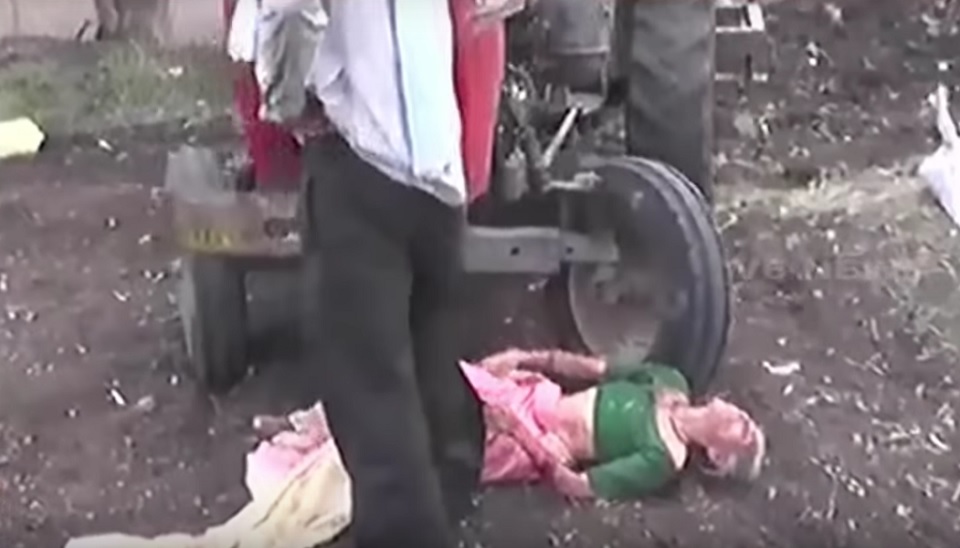 ভিডিওতে দেখা যায়, বারবার টেনে হিচড়ে বৃদ্ধ মাকে ট্রাক্টরের সামনে রাখা হচ্ছে। অন্য পক্ষ সরিয়ে দিচ্ছে আবার তাকে ট্রাক্টরের সামনে রাখা হচ্ছে।