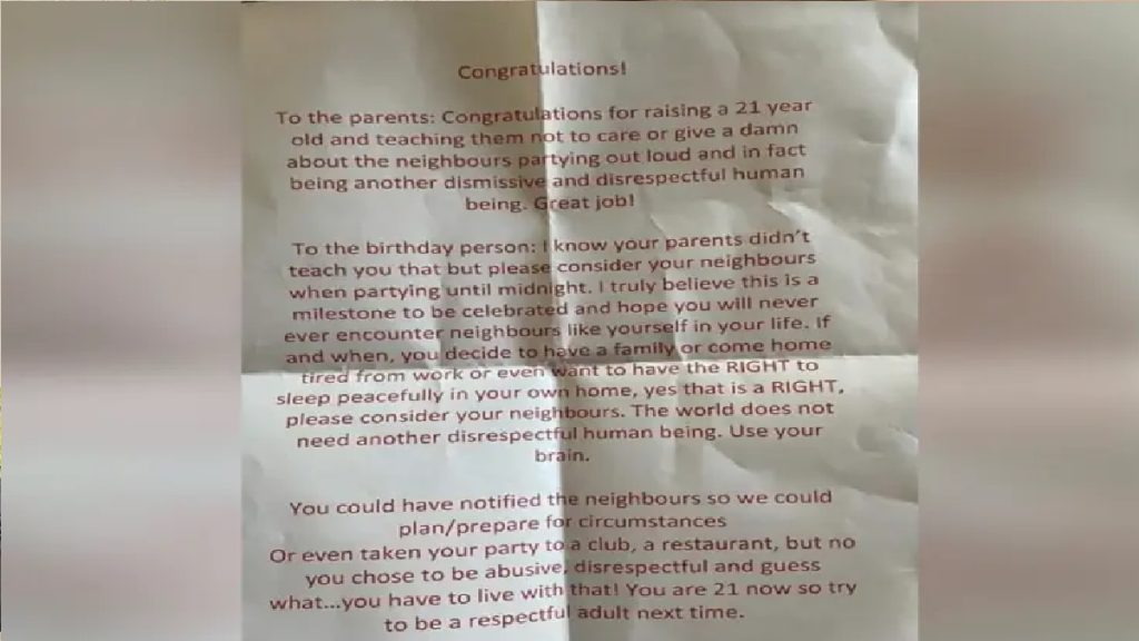 লাল কালিতে লেখা চিঠিতে বার্থডে বয়ের বাবা-মাকে ব্যঙ্গাত্মকভাবে ‘অভিনন্দন’ জানিয়ে তিনি লেখেন, একজন ২১ বছর বয়সীকে বড় করে তোলার জন্য এবং উচ্চস্বরে পার্টি করে প্রতিবেশীদের বিরক্ত করা, এবং ছেলেকে সঠিক শিক্ষা না দেয়ার জন্য তার বাবা-মাকে অভিনন্দন।