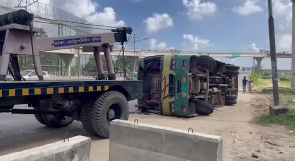 রাজধানীর বিমানবন্দর সড়কে নিয়ন্ত্রণ হারিয়ে উল্টে গেছে ভিআইপি পরিবহনের একটি বাস।