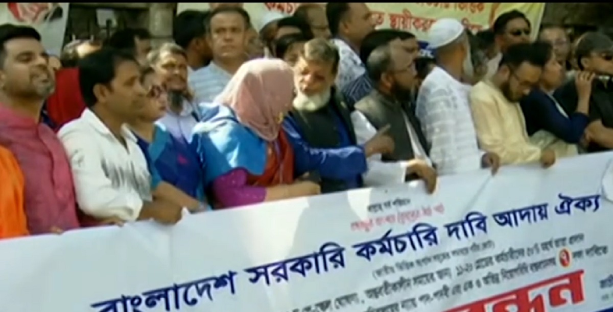 সাত দফা দাবিতে সরকারি কর্মচারী দাবি আদায় ঐক্য পরিষদের মানববন্ধন