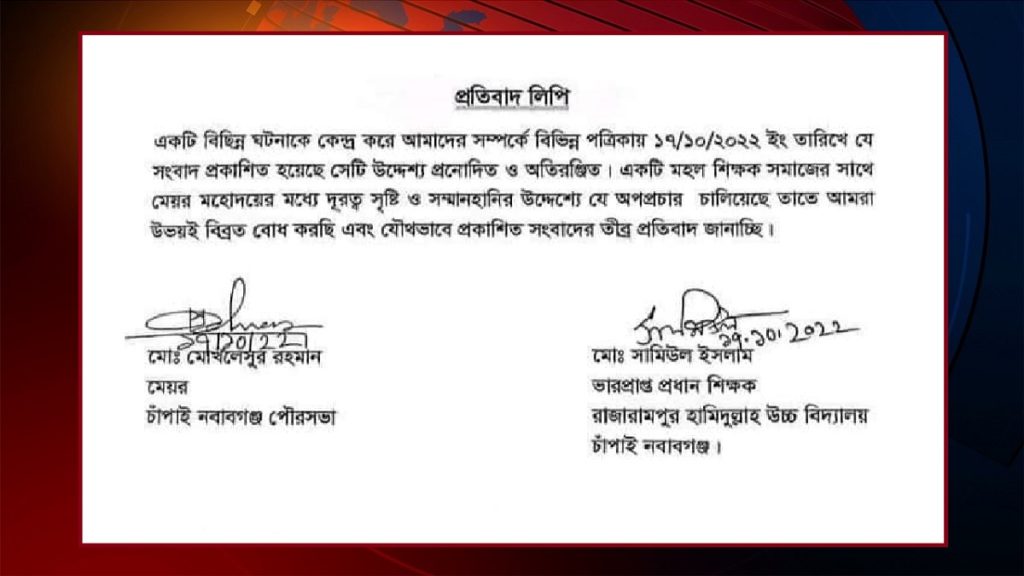 চাঁপাইনবাবগঞ্জে পৌর মেয়র ও তার লোকজনের বিরুদ্ধে প্রধান শিক্ষককে মারধরের খবর যখন ব্যাপক আলোচনায় এমন মুহূর্তে খবর আসে, মেয়র ও প্রধান শিক্ষক সমঝোতা করেছেন। সোমবার রাত ১০টার দিকে সামাজিক যোগাযোগমাধ্যমে দেখা যায়, মেয়র মোখলেসুর রহমান ও হামিদুল্লাহ উচ্চ বিদ্যালয়ের ভারপ্রাপ্ত প্রধান শিক্ষক সামিউল ইসলাম স্বাক্ষরিত একটি প্রতিবাদলিপি। সেখানে বলা হয়েছে, একটি বিছিন্ন ঘটনাকে কেন্দ্র করে আমাদের সম্পর্কে বিভিন্ন পত্রিকায় ১৭ অক্টোবর যে সংবাদ প্রকাশিত হয়েছে সেটি উদ্দেশ্যপ্রণোদিত ও অতিরঞ্জিত। একটি মহল শিক্ষক সমাজের সাথে মেয়র মহোদয়ের মধ্যে দূরত্ব সৃষ্টি ও সম্মানহানির উদ্দেশ্যে যে অপপ্রচার চালিয়েছে তাতে আমরা উভয়ই বিব্রতবোধ করছি এবং যৌথভাবে প্রকাশিত সংবাদের তীব্র প্রতিবাদ জানাচ্ছি।