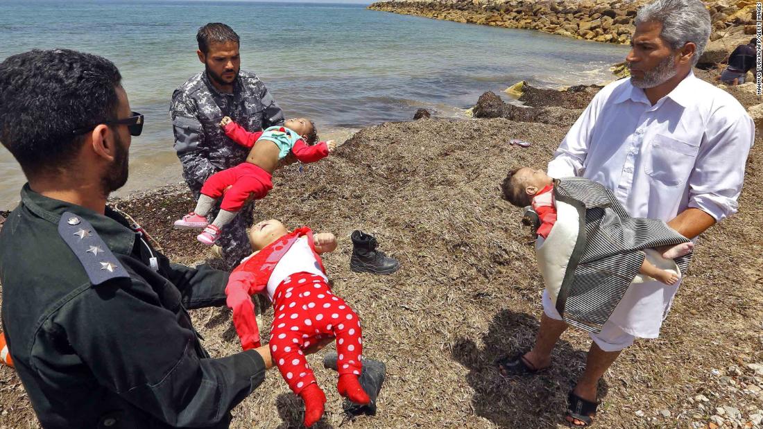 EDITORS NOTE: Graphic content / Members of the Libyan security forces and a civilian carry the bodies of babies as migrants who survived the sinking of an inflatable dinghy boat off of the coast of Libya are brought ashore in al-Hmidiya, east of the capital Tripoli on June 29, 2018. - The bodies of three babies were recovered and around 100 people were missing after a migrant boat sank off the coast of Libya, survivors and the coastguard said. (Photo by Mahmud TURKIA / AFP) (Photo credit should read MAHMUD TURKIA/AFP/Getty Images)