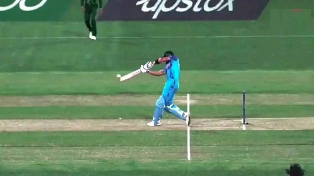 বিরাট কোহলিকে করা এই বলটি আম্পায়ার নো বল ডাকেন। ছবিতে স্পষ্ট দেখা যাচ্ছে, বিরাট কোহলির পেছনের পা পপিং ক্রিজ স্পর্শ করে আছে। বল হিট করার সময় বলটি বিরাটের কোমরের উচ্চতার বেশি। নিয়ম অনুযায়ী বলটি নো বল।