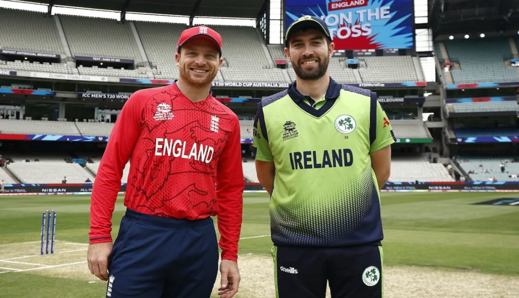 টি-টোয়েন্টি বিশ্বকাপে গ্রুপ ওয়ানের ম্যাচে মেলবোর্নে টস জিতে আয়ারল্যান্ডের বিরুদ্ধে ফিল্ডিং বেছে নিয়েছে ইংল্যান্ড। তবে বৃষ্টির কারণে আউটফিল্ড এখনও ভেজা থাকায় ম্যাচ শুরু হতে বিলম্ব হচ্ছে। আবহাওয়ার পূর্বাভাসে বলা হয়েছে, মেলবোর্নে আজ (২৬ অক্টোবর) সারাদিনই বজ্রসহ বৃষ্টি হতে পারে।