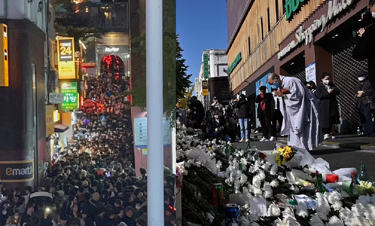 হ্যালোইন উৎসবের ভিড় (বামে), নিহতদের প্রতি শ্রদ্ধা নিবেদন (ডানে)। ছবি: সংগৃহীত।