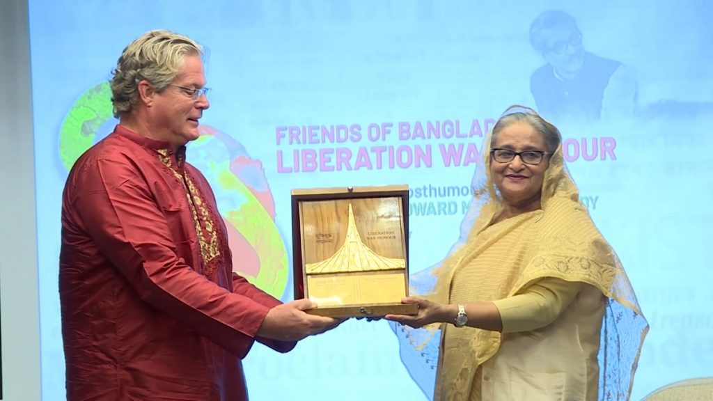 মহান মুক্তিযুদ্ধে বাংলাদেশের পক্ষে ভূমিকা রাখায় মার্কিন সিনেটর এডওয়ার্ড এম কেনেডির প্রতি কৃতজ্ঞতা প্রকাশ করেছেন প্রধানমন্ত্রী শেখ হাসিনা। এ সময়, বাংলাদেশের স্বাধীনতা যুদ্ধে অবদানের স্বীকৃতিস্বরূপ প্রয়াত মার্কিন সিনেটর এডওয়ার্ড এম. কেনেডি সিনিয়রের ছেলে টেড কেনেডির হাতে ‘ফ্রেন্ডস অব বাংলাদেশ’ পদক তুলে দেন প্রধানমন্ত্রী।