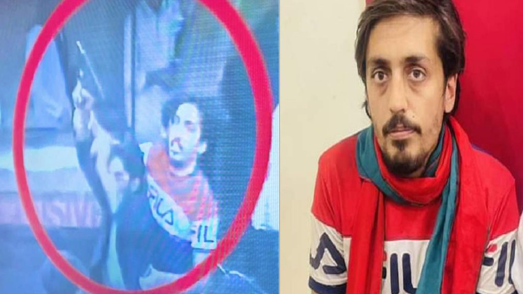 হামলা করার মুহূর্তের একটি ছবি ধরা পড়ে সিসিটিভি ক্যামেরায়। সেখানে বন্দুক হাতে দেখা যাচ্ছে হামলাকারীকে। তবে তার বন্দুকটির নল আকাশের দিকে তাক করা। কারণ পেছন থেকে তার বন্দুক ধরা হাতটি টেনে ধরেছেন ওই যুবক। তার পরনে লাল-সাদা-নীল একটি টি-শার্ট।