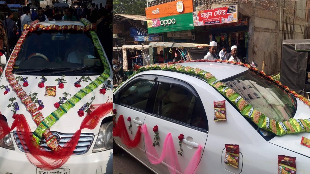চিপস, ঝালমুড়ি ও ডালমুঠের প্যাকেট দিয়ে সাজানো হয়েছে জাহিদ হাসান নামে এক সৌদি প্রবাসীর বিয়ের গাড়ি। ব্যতিক্রমভাবে সাজানোর এ গাড়ির ছবি তুলে অনেকেই এরইমধ্যে ছড়িয়ে দিয়েছেন সামাজিক যোগাযোগমাধ্যমে। আর এরপরই শুরু হয়েছে তুমুল আলোচনা।