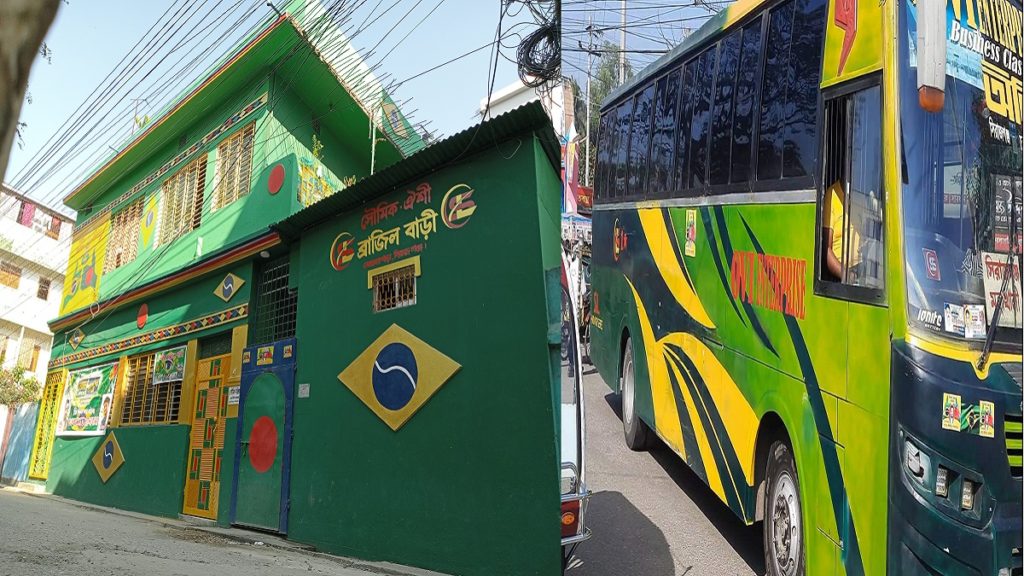 দূর থেকে দেখে মনে হবে ব্রাজিলের পতাকা মোড়ানো বাড়ি। কাছে গেলেই বোঝা যায় পুরো বাড়ি রং করা হয়েছে ব্রাজিলের পতাকার আদলে। বিশ্বকাপ ফুটবল আসলেই সিরাজগঞ্জ পৌর এলাকার ব্রাজিল ভক্ত লিটন সরকার এভাবেই রাঙ্গায় তার বাড়ি। শুধু বাড়িই নয় সিরাজগঞ্জ থেকে ঢাকাগামী অভি এন্টারপ্রাইজের একটি গাড়ীকেও রং এ এঁকেছেন ব্রাজিলের পতাকা।