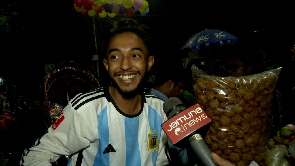 স্বাভাবিকভাবে বাংলাদেশেও এই ম্যাচ নিয়ে উত্তেজনা কম ছিল না। ঢাকা বিশ্ববিদ্যালয়ের টিএসসিতে ছিল খেলা দেখার আয়োজন। বড় স্ক্রিনে খেলা দেখতে জড়ো হয়েছিলেন প্রচুর সমর্থক। এরমধ্যে এমন এক তরুণকে খুঁজে পাওয়া যায়, যিনি আর্জেন্টিনার জার্সি পরে খেলা দেখতে এসেছিলেন। তবে তিনি মেসিদের সমর্থক নয় বলে জানান।