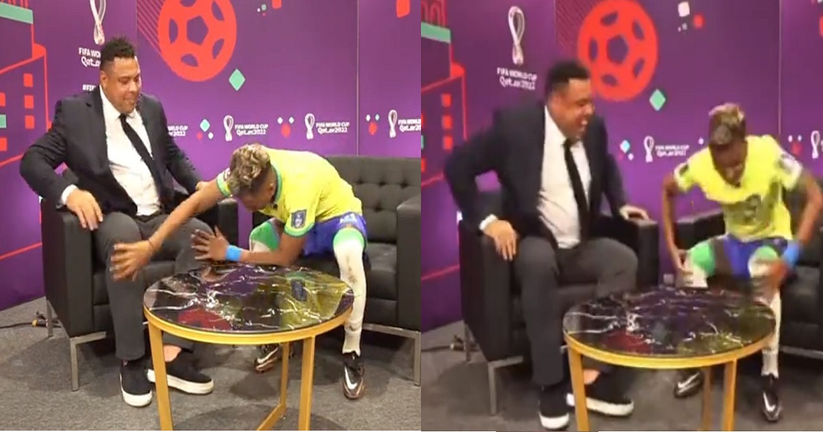 সাক্ষাৎকারের শেষে রদ্রিগোকে শুভ কামনা জানিয়ে তার সঙ্গে হাত মেলান রোনালদো। তখনই রদ্রিগো হঠাৎ রোনালদোর পা স্পর্শ করেন। তার পায়ের হাঁটু থেকে নিচ পর্যন্ত ছুঁয়ে দেখেন এবং তারপর হাত দু’টো নিজের পায়ে ছোঁয়ান। যেন রোনালদোর পায়ের জাদু নিজের পায়ে নিয়ে নিলেন রদ্রিগো। এই দৃশ্য দেখে রোনালদো হো হো করে হেসে ওঠেন। জানান শুভ কামনা।