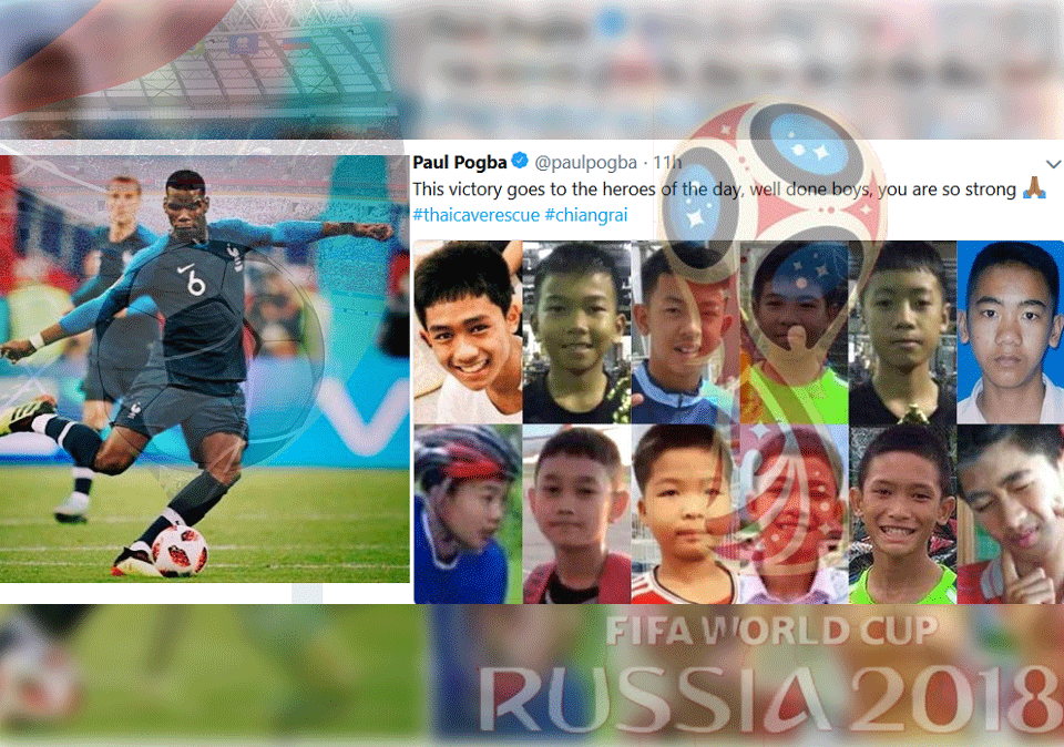 রাশিয়া বিশ্বকাপের সেমিফাইনালে বেলজিয়ামের বিপক্ষে ১-০ গোলে জয়ের পর সেটি থাইল্যান্ডের গুহা থেকে উদ্ধার পাওয়া কিশোর ফুটবলারদের উৎসর্গ করেছেন ফ্রান্সের মাঝ মাঠের কাণ্ডারি পল পগবা।