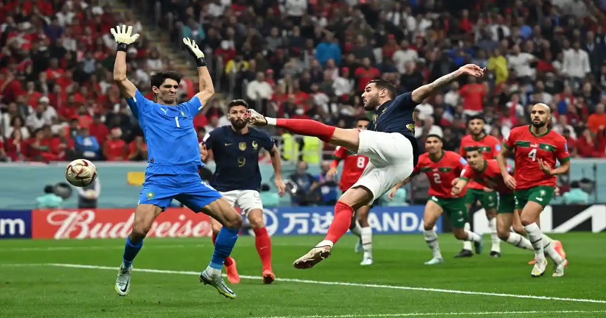 ফ্রান্সের বিপক্ষে অঘটনের স্বপ্ন নিয়ে খেলতে নামে ওয়ালিদ রেগ্রাগুইয়ের শিষ্যরা। কিন্তু ম্যাচের ৫ মিনিটেই ডানপ্রান্ত থেকে কিলিয়ান এমবাপ্পের দিকে বল বাড়ান আতোয়ান গ্রিজমান। তবে তার সামনে বেশ কয়েকজন ডিফেন্ডার থাকায় বল চলে যায় ডি বক্সের বাম পাশে অরক্ষিত থাকা থিও হার্নান্দেজের সামনে। অ্যাক্রোবেটিক ভলিতে দুরূহ কোণ থেকে মরোক্কান গোলরক্ষক বোনোকে পরাস্ত করে ফ্রান্সকে এগিয়ে দেন থিও হার্নান্দেজ।