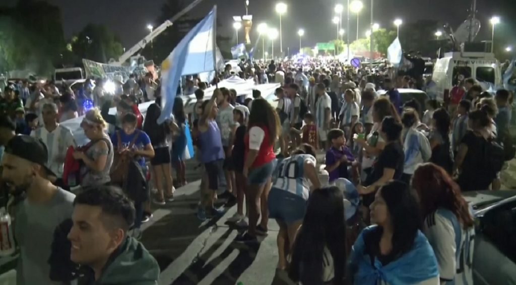 জাদুকর মেসিকে বরণ করে নিতে যেন তর সইছে না ভক্তদের। তাদের কথা- যারা ৩৬ বছর পর সাড়ে চার কোটি মানুষের দেশটিতে আনন্দের উপলক্ষ এনে দিয়েছেন তারা জাতীয় বীর। রাতের আঁধার চিড়ে ধ্বনিত হচ্ছে ‘মেসি-আর্জেন্টিনার জয় হোক’ স্লোগান। অনেকেই স্মরণ করছেন প্রয়াত আরেক কিংবদন্তি দিয়াগো ম্যারাডোনাকেও। যার হাত ধরেই ১৯৮৬ সালে বিশ্বকাপ ট্রফি ঘরে নিয়েছিল আর্জেন্টিনা।