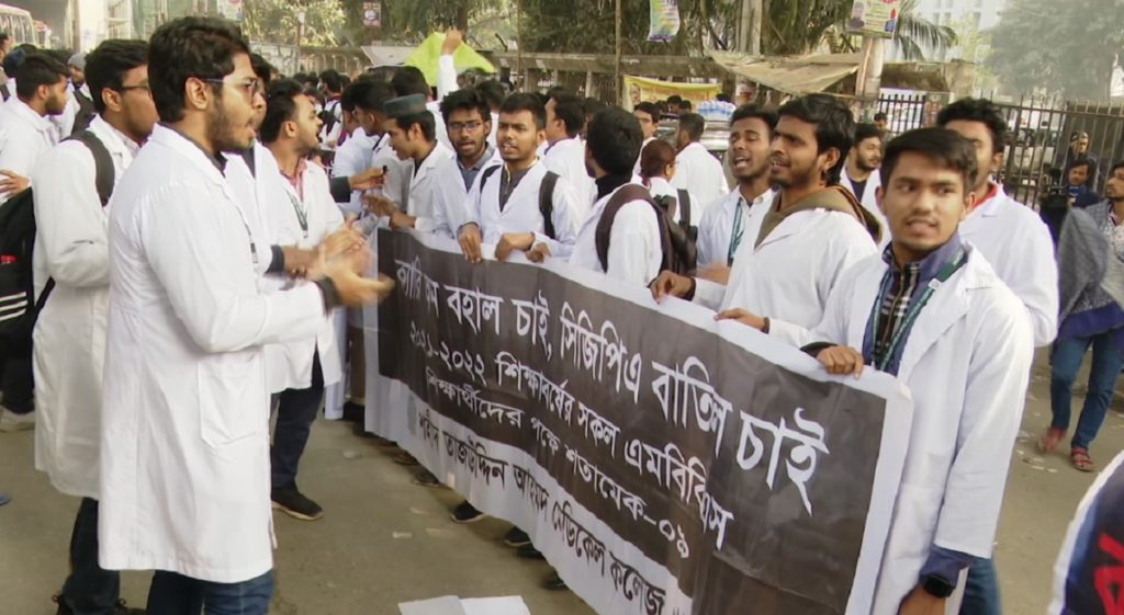 বিক্ষোভরত শিক্ষার্থীরা বলেন, বিএমডিসি ক্যারি অন সিস্টেম বাতিল করে অযৌক্তিক সিদ্ধান্ত নিয়েছে। সিজিপিএ সিস্টেম বাতিলের দাবিও জানান আন্দোলনকারীরা।