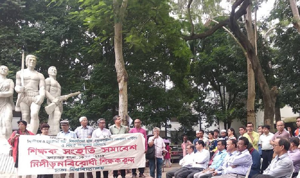 নিরাপদ ক্যাম্পাসের দাবি ও মামলার শিকার শিক্ষার্থীদের মুক্তির দাবিতে ঢাকা বিশ্ববিদ্যালয়ে সংহতি সমাবেশ করেছে শিক্ষকরা। নিপীড়নবিরোধী শিক্ষকবৃন্দের ব্যানারে আজ অপরাজেয় বাংলার পাদদেশে সকালে এ সমাবেশ শুরু হয়। এতে বিভিন্ন বিশ্ববিদ্যালয়ের শিক্ষকরাও যোগ দেন। সমাবেশে অংশ নেন শিক্ষার্থীরাও।