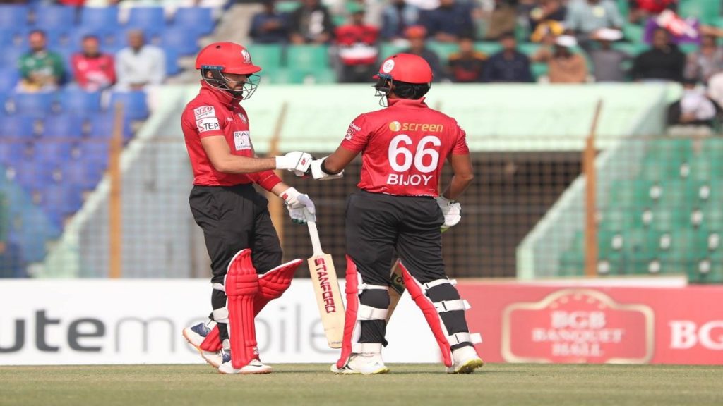 ৩ নম্বরে ব্যাট করতে আসেন দলীয় অধিনায়ক সাকিব আল হাসান। মৃত্যুঞ্জয়ের প্রথম দুই বলে দুই চার মেরে ভালো শুরুর জানান দিলেও তৃতীয় বলেই বোল্ড হয়ে সাজঘরে ফেরেন সাকিব। তবে, রানের চাকা সচল রাখেন ওপেনার আনামুল হক বিজয় এবং আফগান ব্যাটার ইব্রাহিম জাদরান। দলীয় ৭১ রানে এবং ব্যাক্তিগত ৩০ রান করে ভিজয়কান্থের বলে আউট হন আনামুল হক বিজয়।