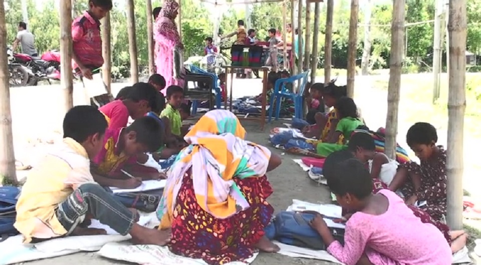 বিদ্যালয়ের প্রধান শিক্ষক আফরোজা বেগম বলেন, ‘স্কুল ভবনটি বিলীন হওয়ায় পর থেকে ক্লাস করার উপায় ছিলো না শিক্ষার্থীদের। বিকল্প হিসেবে আশ্রয় নেয়া হয়েছে স্বাস্থ্য কেন্দ্রের মাঠে খোলা আকাশের নিচে। কয়েকটিন টিনের ছাপড়া ঘর তুলে শিক্ষার্থীদের পাঠদানসহ বিদ্যালয়ের সার্বিক কার্যক্রম চলছে। খোলা জায়গায় কখনো রোদ, কখনো বৃষ্টির মধ্যেই শিক্ষার্থীদের পড়ালেখা করতে নানা সমস্যার সম্মুখিন হতে হচ্ছে। রোদে পুড়ে বসতে, লিখতে, পড়তে ধুলাবালি আর অসহনীয় গরমেও ক্লাস নিতে বাধ্য হচ্ছেন শিক্ষকরা। তাছাড়া নেই টিউবয়েল ও কোন টয়লেট ব্যবস্থা। এক দুর্বিসহ পরিবেশে চলছে পাঠদান কার্যক্রম। বর্তমানে বিদ্যালয়ের নামে কিছু বরাদ্দ হয়েছে। সেই বরাদ্দের অর্থে বিদ্যালয় পরিচালনার জন্য অবকাঠামো তৈরির পরিকল্পনা চলছে। দ্রুতই এ পরিকল্পনা বাস্তবায়ন হবে’।