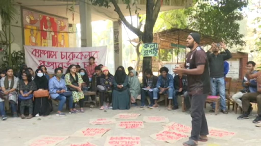 গত বছরের নভেম্বর থেকে চট্টগ্রাম শহর থেকে ২২ কি.মি দূরে চট্টগ্রাম বিশ্ববিদ্যালয়ের মূল ক্যাম্পাসে ফিরে যাওয়ার দাবিতে বিক্ষোভ করে আসছেন চারুকলার শিক্ষার্থীরা।
