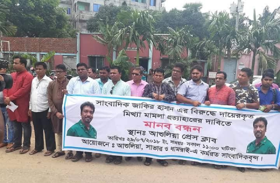 বেসরকারি টেলিভিশন চ্যানেল আই’য়ের সাভার প্রতিনিধি জাকির হাসানের বিরুদ্ধে চাঁদাবাজির মিথ্যা মামলা দায়েরের প্রতিবাদে মানববন্ধন করেছে সাভার, অাশুলিয়া ও ধামরাইয়ের কর্মরত সাংবাদিকরা।