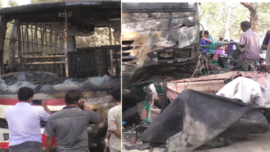এই দুর্ঘটনা ঘটে। নিহতরা সবাই অটোরিকশার যাত্রী। দুর্ঘটনার পর আগুন লেগে পুড়ে ছাই হয়েছে বাসটি।