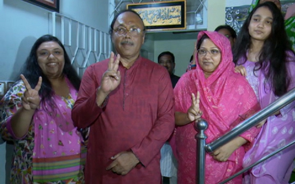 বিজয়ের পর পরিবারের সদস্যদের পাশে নিয়ে বিজয় চিহ্ন দেখান এএইচএম খায়রুজ্জামান লিটন