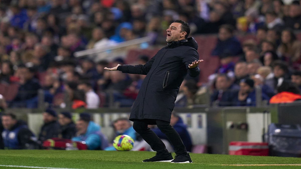 আলমেরিয়ার বিরুদ্ধে খেলার সময় ডাগআউট থেকে জাভির প্রতিক্রিয়া।