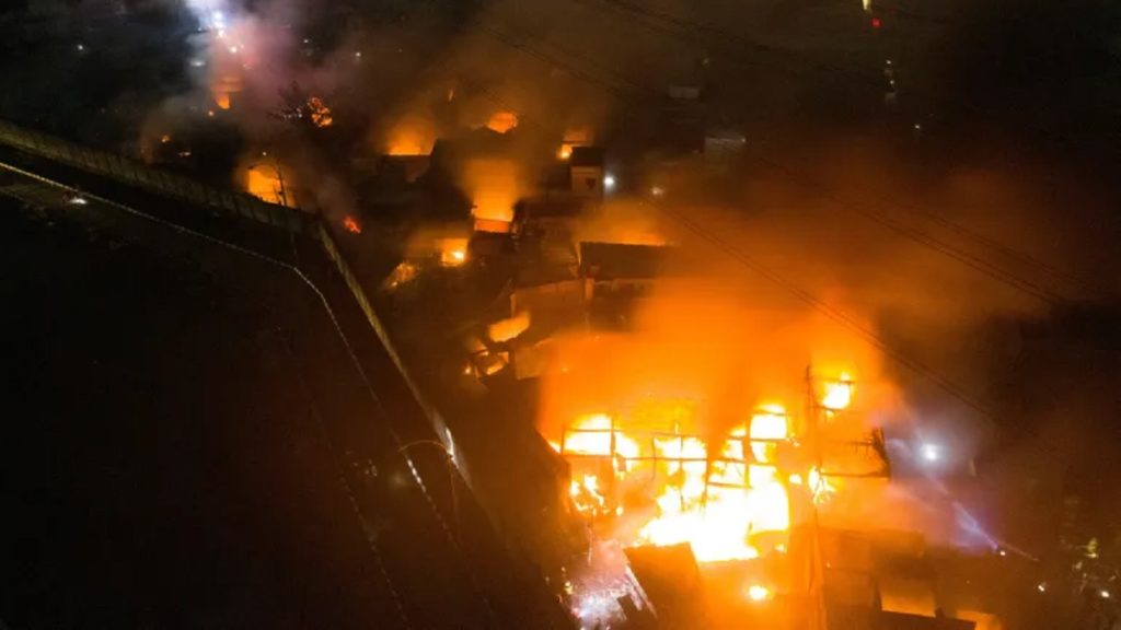 প্রত্যক্ষদর্শীরা জানান, স্থানীয় সময় রাত আটটার দিকে আগুনের সূত্রপাত হয়। এ সময় পরপর বেশ কয়েকটি বিস্ফোরণের আওয়াজ পাওয়া যায়। আগুন ছড়িয়ে পড়ে আবাসিক এলাকাতেও। দ্রুতই আশপাশের বাড়িঘর থেকে কয়েক হাজার মানুষকে সরিয়ে নেয়া হয়।